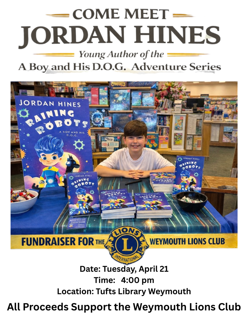On April 21 at 4:00 PM, Jordan Hines, young co-author of A Boy and His D.O.G., will be at Tufts Library in Weymouth, MA for a fundraiser benefiting the Weymouth Lions Club.